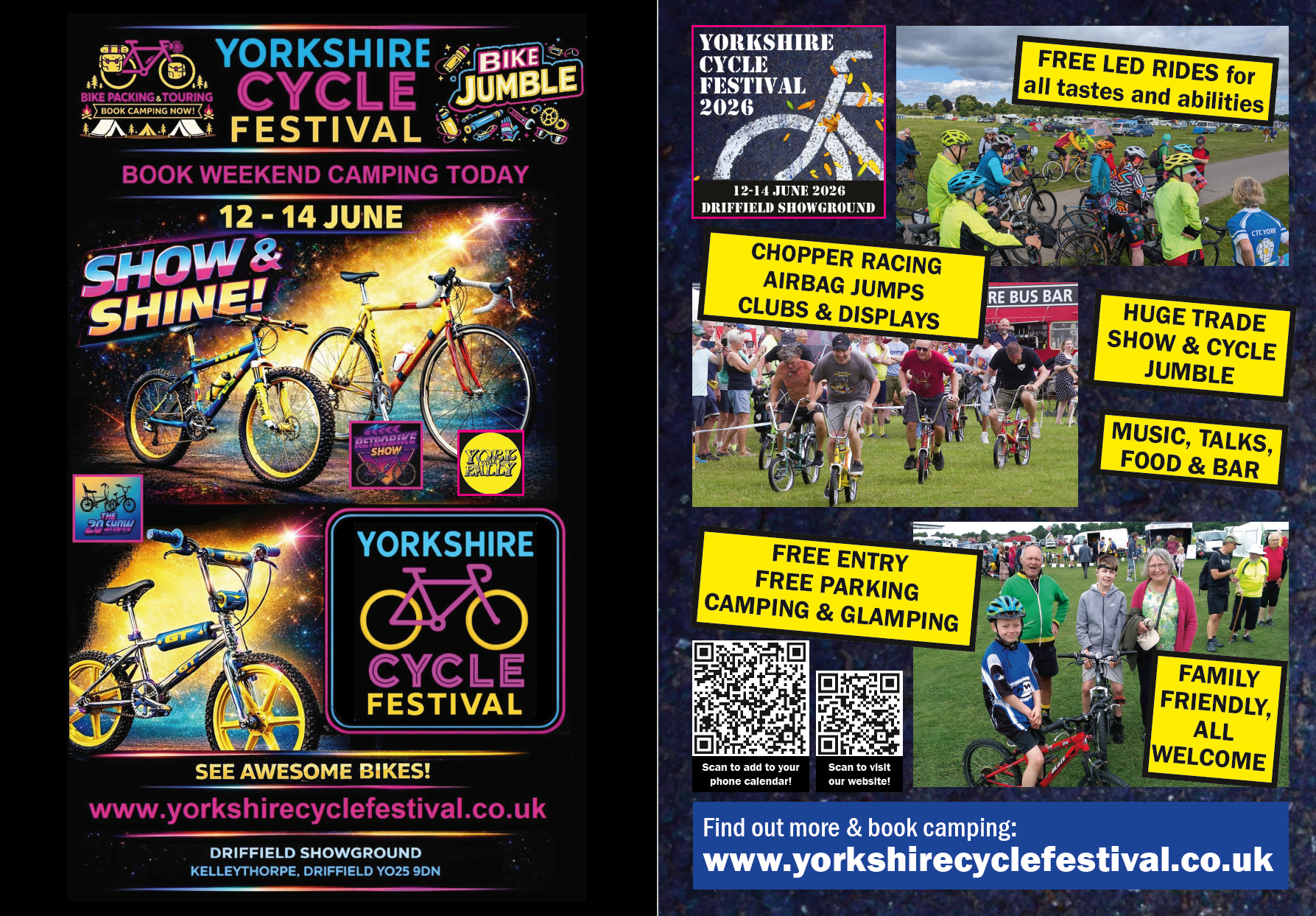 We have some major news about 2026. Next year’s event will be held at Driffield Showground on the 12th to 14th June 2026, because for reasons beyond our control we cannot use the Knavesmire in York. It will be called the Yorkshire Cycle Festival 2026.